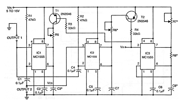 We found this circuit in a technical documentation from the 70s. The MC1555 is nothing more than the well-known 555 in the old version of Motorola. The circuit generates fractional hertz signals, determined by the capacitors next to the 555. The transistors can be the BC558 and the circuit has two outputs. The components with the asterisk are chosen according to the application, that is, with the frequencies and forms of signal must be generated.