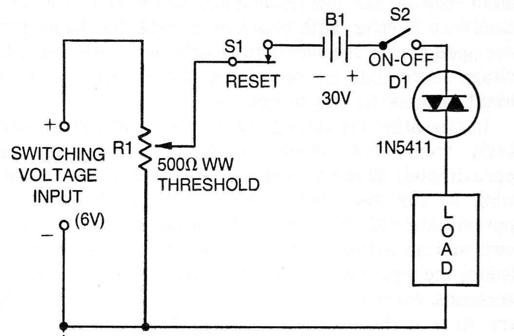 We found this circuit in a technical documentation on thyristors from the 70s. The circuit is set to fire with a signal whose intensity is determined by R1. The B1 battery takes the Diac to the trigger threshold, and other voltages can be used according to the characteristics of this component. The load is low current with a maximum of 15 mA, depending on the characteristics of the diac.