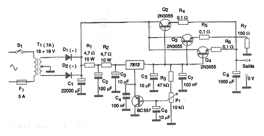 Using an integrated voltage regulator as a reference, we can control several power transistors of type 2N3055 and thereby obtain a stable high voltage output. For a 13.6 V output this type of source is ideal for powering mobile communication equipment such as VHF and UHF transceivers for automotive use, on a repair bench or for fixed use. The circuit shown in the figure uses two 2N3055 transistors each controlling a current of 2.5 A which gives a maximum output value of 7.5 A. If the reader needs less current, it can use only one or two 2N3055. Note that at the emitter of each transistor we use a low value wire resistor. The purpose of this resistor is to ensure that the current is divided equally among all the transistors, since in conduction they have different resistances. Without them, the current would split unevenly, overloading one of the transistors that it would then burn. When assembling this type of source, the main care is to use wires of a thickness appropriate to the intensity of the current to be conducted. It will be convenient to protect the circuit by fuses both at the entrance and at the exit. It is also important to note that power transistors must be equipped with excellent heat radiators. The 7812 integrated circuit also needs to be mounted on a heat radiator. The 0.1 ohm and 4.7 ohms resistors must be wired. In the trimpot you can adjust the output voltage to values between 12 and 13.6 V approximately.