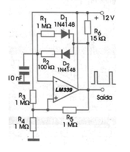 Another interesting way of generating signals with small active cycles, that is, short pulses, is by using different circuits for charging and discharging the timing capacitor. In the circuit shown in the figure, the ratio of values between R3 and R4 determines the active cycle. The integrated circuit used in the simulation is the operational amplifier 741, as a voltage comparator. However, equivalents that reach higher frequencies can be used.