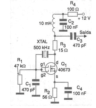 The circuit shown in the figure is characterized by stability and the use of a common component. This circuit can generate signals in the range from 100 kHz to 500 kHz depending only on the crystal used. The component values are for a 12 V supply with the indicated transistor, originally manufactured by RCA. Double-gate equivalents can be experimented with possible changes in the polarization components. Changes in the 100 ohms resistor, in series with the power supply, allow the use of sources with other voltages. Remember that the current drained by the step is of the order of 8 mA. This allows you to calculate the voltage drop across the resistor.