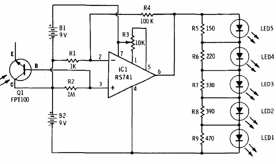 We found this circuit in a 1977 Radio Shack catalog. We can mount it with any phototransistor and LEDs are common with the need for a 100 ohms resistor in series with pin 6 of the IC for current limitation. The null point adjustment is done in R3.