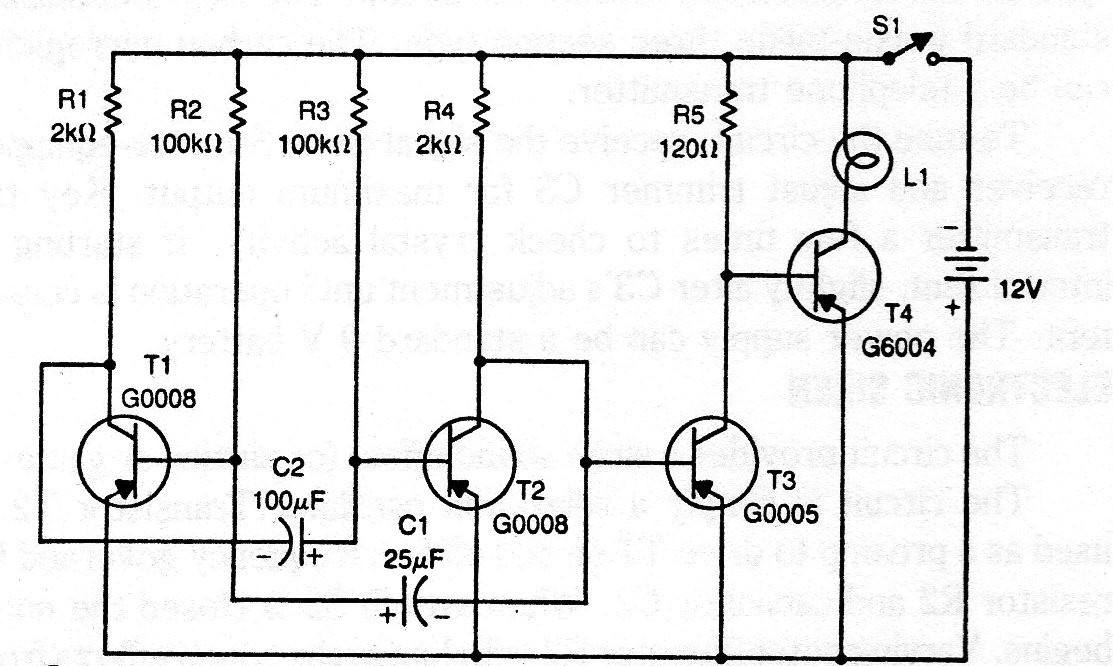 This circuit was found in an old American publication from the 70s. It flashes a warning lamp, being powered by 12 V and, therefore, suitable for automotive use. The frequency of blinks depends on C1 and C2. Transistors T1, T2 and T3 can be BC558 and T4 can be a TIP31 for lamps up to 1 A. The resistors can also be changed to match the characteristics of the most modern transistors.