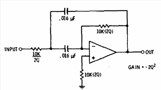 This circuit is from a 1976l filter cookbook. The circuit has a factor Q = 3, and must be supplied with a symmetrical source of 6 to 12 V. Other frequencies can be obtained by changing the components.