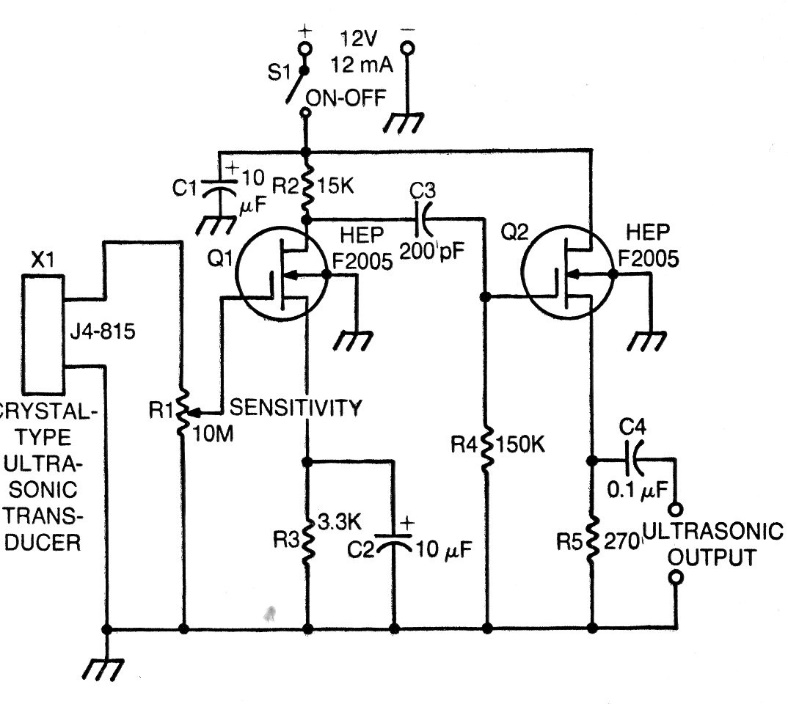 The MOS field effect transistors of this circuit are not very common, as it is a project from the 70s, obtained in a documentation of the time. However, the circuit can be adapted to use modern transistors. The pickup is a piezoelectric or ceramic crystal cut to operate in the ultrasound range. The circuit has low consumption, and its output is of good intensity and can be used in several types of applications.