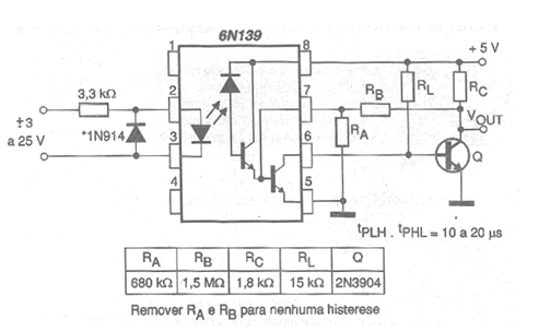 In the figure we present a circuit that has an insulation voltage of 2,500 V at 60 Hz and rejection in high common mode. The maximum data transfer speed allowed for this circuit is 40 kB / s with cables whose length can reach up to 1500 meters. A hysteresis feature increases the circuit's immunity to noise. The recommended transistor is 2N3904, but general-purpose equivalents can be used.