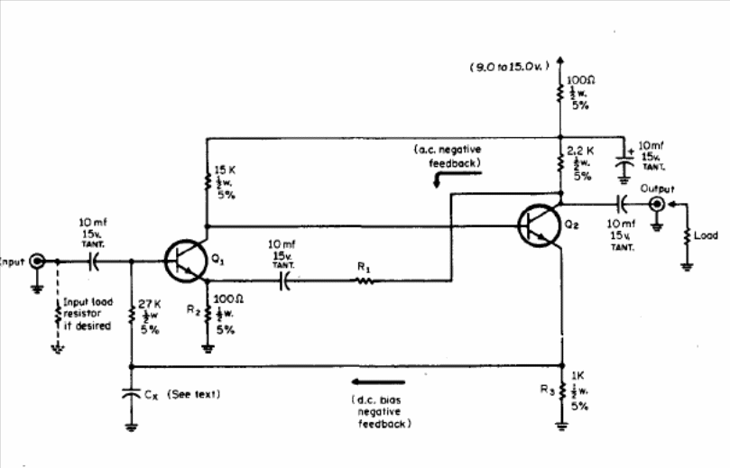 The circuit shown is from a 1972 publication. Transistors can be current types like 2N2222. The gain is adjusted by the value of R1 and can be between 38 and 44 dB. The load is 1 k ohms, and the maximum signal amplitude is 1 Vpp. Among the applications for this circuit we can mention the use with photodiodes and other sensors. Cx can be a 100 pF capacitor, preferably mica.
