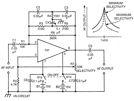 This traditional configuration of bandpass or bandpass filter with operational 741 was found in a 1976 documentation. The circuit is tuned to a frequency of 1 kHz and must be powered by voltages between 6 and 12 V. The consumption is very low, of the order 3 mA. See in the math section for electronics on the author's website how to calculate the double T components for other frequencies. Remember that the maximum frequency of the 741 for this application is around 100 kHz.