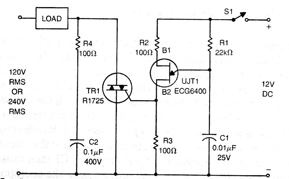 This circuit is from a technical documentation from the 70s provided by GE, but it can be implemented with Triacs of the TIC series and the unijunction may be the well-known 2N2646. The circuit controls a load connected to the grid from a voltage of 12 V. The circuit can be used with low current sensors. The Triac must be equipped with a heat radiator.