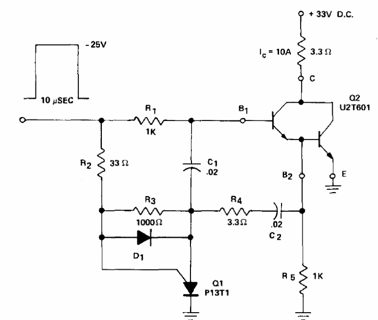 This circuit, from a 1975 technical documentation, switches a load in just 125 ns from a 10 ns pulse. The circuit can control 10 A loads with the components used, but they can be changed to other loads. The power transistor depends on the load that must be controlled and must be mounted on a heatsink.
