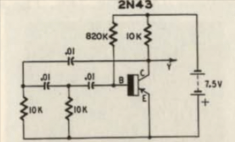 The circuit presented was found in a documentation from the 1950s, generating a sinusoidal signal that depends on the capacitors of the feedback network. The original circuit uses a germanium transistor, but it can be adapted to operate with silicon transistors. The supply voltage can also be slightly higher, up to about 9 V.