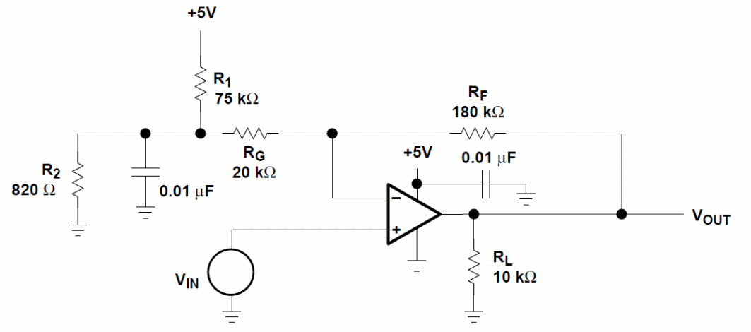 This configuration is from Texas Instruments technical documentation. In it we have the way to use an operational for a voltage gain of 10 times. The gain is given by the relationship between RF and RG and the power supply, in this case, it does not need to be symmetrical. The operational ones used can be those of the TL and TLC series from Texas.