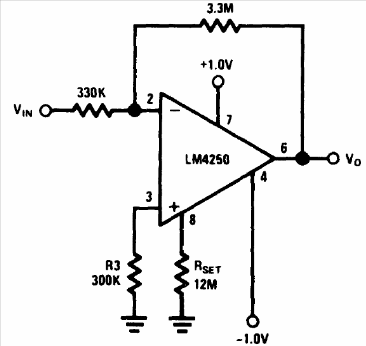 This circuit, suggested by the Linear Applications Handbook of National Semiconductor, uses a very low voltage operating system, presenting a voltage gain 10. The circuit can be powered by a symmetrical power source of only 1 V.