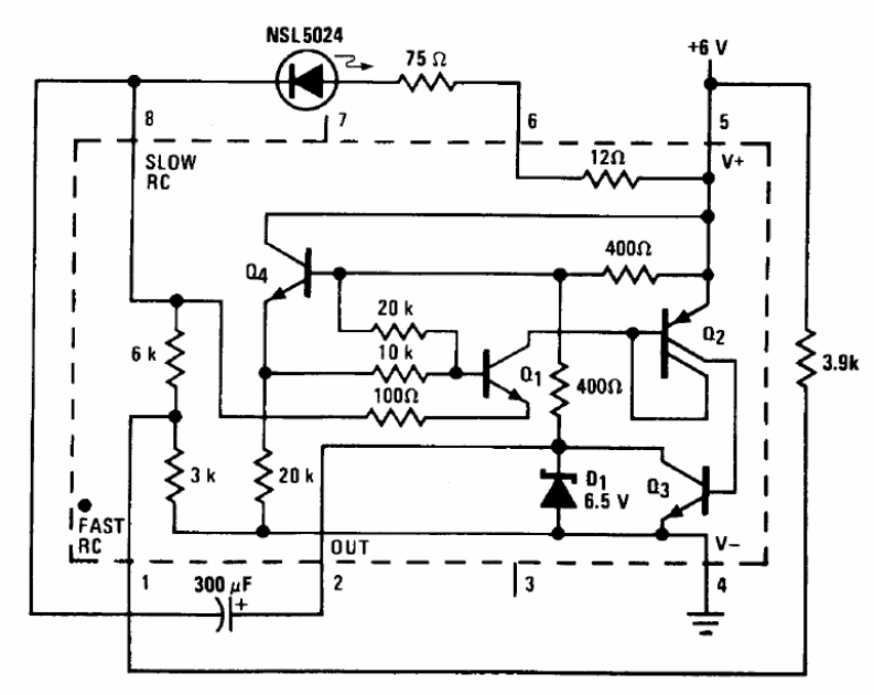 The presented circuit uses the National Semiconductor's LM3909, an oscillator that operates with very low voltages, starting at 1.2 V. The circuit is for 6 V supply and uses a common LED. The circuit is from National technical documentation.