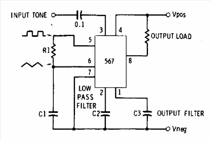 This circuit can decode an audio tone whose frequency depends on R1 and C1. R1 can be in the range of 2k to 20k and the frequency is given by f = 1 / R1 x C1. The circuit is from an American publication of 1975 and must be powered by voltages between 6 and 10 V. The load triggered when the circuit output goes to low level.