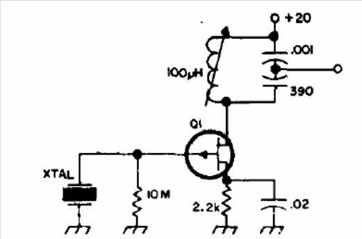 We found this oscillator in a documentation from the 70s. The FET can be MPF102 and the crystal is 1 MHz. The circuit can use crystals for other frequencies. The output is of low intensity, but it can excite power steps in the elaboration of a transmitter or another type of application.