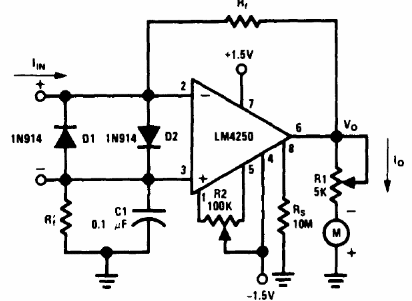 The circuit shown can measure currents less than 1 uA and is powered by two 1.5 V batteries in a simple symmetrical source. The circuit is suggested by National Semiconductor in its 1994 Linar Applications Handbook. The instrument is 100 to 200 uA full-scale.