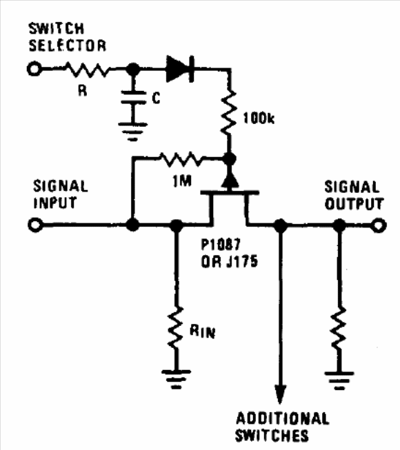This circuit was obtained from the Audio Handbook of the National Semiconductor of 1977. We can use any FET, like the BF245 and the diode is of the type 1N4148. The circuit switches only small audio signals.