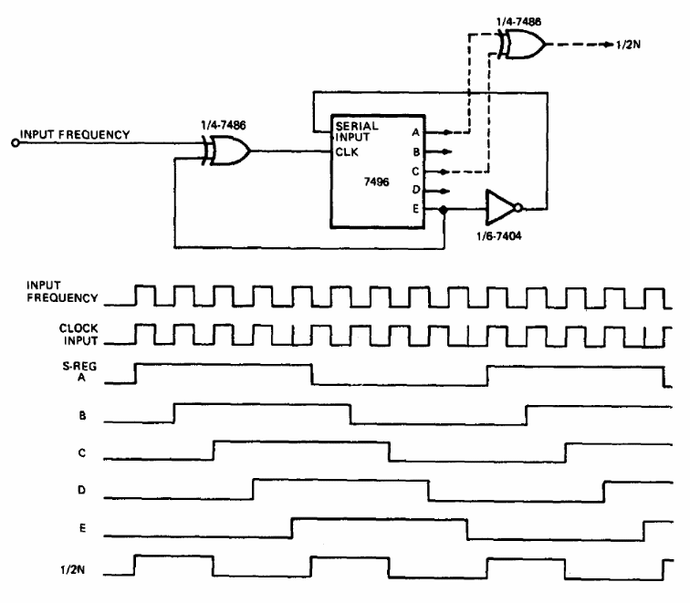 In the figure we have the way to use a shift register to divide the frequency of a signal by 9. The time diagram is given next to the diagram and the maximum frequency depends on the logic used. The circuit can be used as a shield.