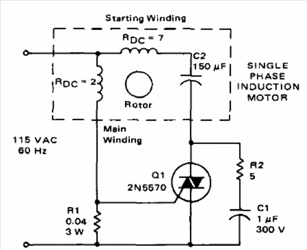We found this circuit in Motorola's Circuit Applications for the Triac 1971 manual. The circuit is for ½ Hp engines that have a start winding. The triac can be an equivalent type of the TIC series.
