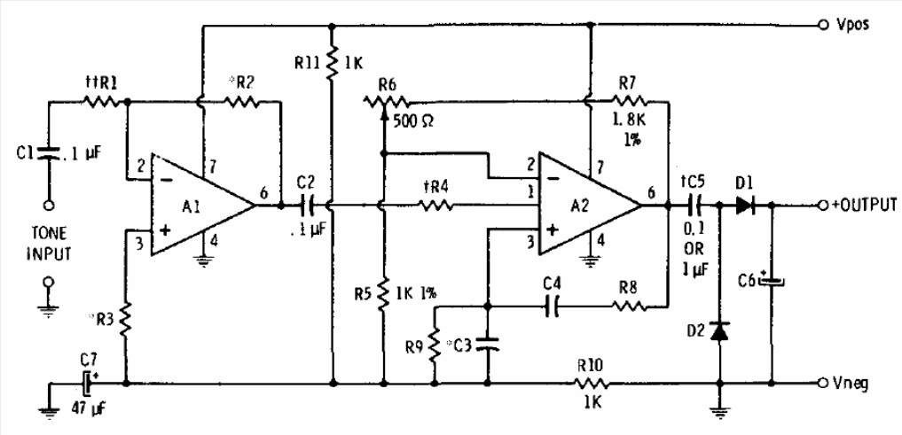 This decoder filter was found in a 1975 documentation. The integrated circuits can be 741. The circuit is used with telephones and must be powered by a symmetrical source. C3, C4, R8 and R9 determine the frequency to be recognized.