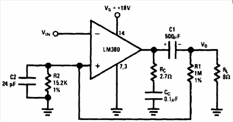 This circuit, which provides a power of up to 3.5 W, can be supplied with voltages from 9 to 14 V. The circuit is from the 1994 Linear Applications Handbook by National Semiconductor. The voltage gain is 200 and the values with narrower tolerances can changed in a less critical application.