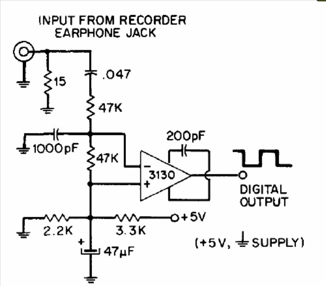 This circuit makes it possible to recover programs recorded on cassette tape as was common in MSX and older computers. The circuit is from a 1977 CMOS databook and must be powered by a 5 V source. The operational amplifier admits equivalent.