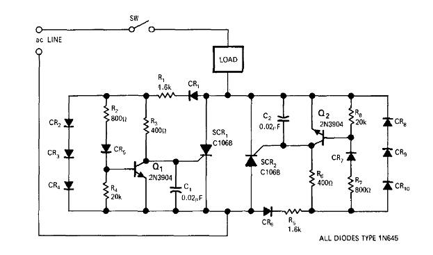 This circuit switches a load in 0.013 ms after closing the switch and after the start of each cycle. SCRs must have current capacities according to the load and the transistors can be BC548. The circuit is from 1971 technical documentation. SCRs must be mounted on heat sinks.