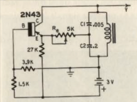This audio oscillator has its frequency determined by C1, C2 and the inductor. The inductor can be the primary winding of a small transistor radio output transformer. The original transistor was made of germanium, but the circuit may have minor modifications to the resistors to operate with silicon transistors. The generated signal is taken from point Y of the diagram.