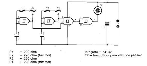 We found this circuit in a 1986 Elettronica Pratica magazine, but the components used are common. As it is a TTL circuit, the supply must be made with a voltage of 5 V. The capacitors of 100 nF for C1 and 10 uF for C2 determine the range of sounds and the effects.