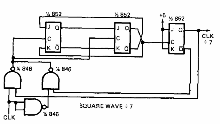 This circuit shows how to use common logic functions to divide a frequency by 7. The output signal is square and integrated circuits of any logic can be used. We can use the circuit as a shield for microcontrollers.