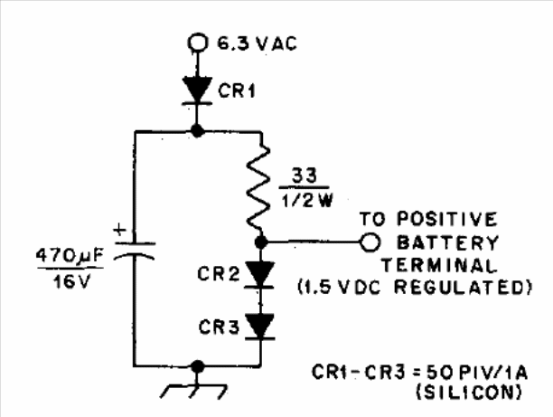 This power supply provides a 1.5 V voltage from the 6.3 V 6 V secondary of a common transformer. The diodes are silicon like 1N4148. The circuit is from 1976 documentation.