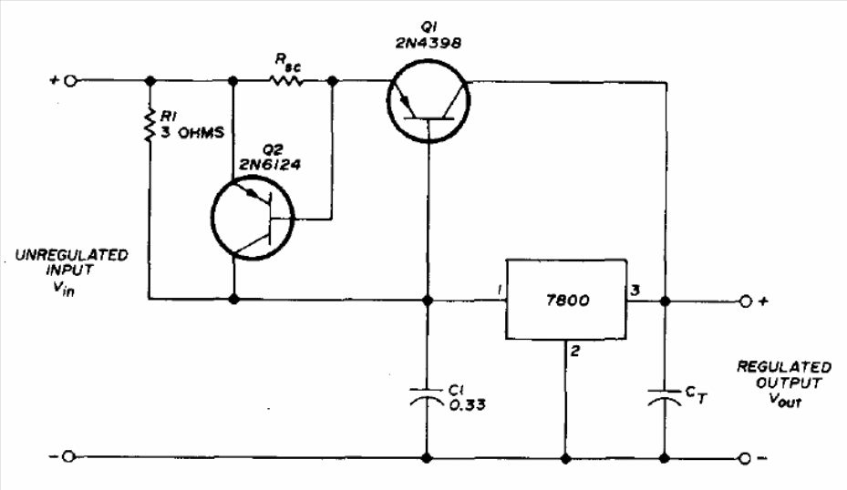 With the original transistor, this circuit can supply a current of up to 30 A. However, we can use more common transistors today for smaller currents. For example, we can use 2N2955 for 15 A. BD136 is the replacement for Q2. The Q1 transistor must have an excellent heat radiator.