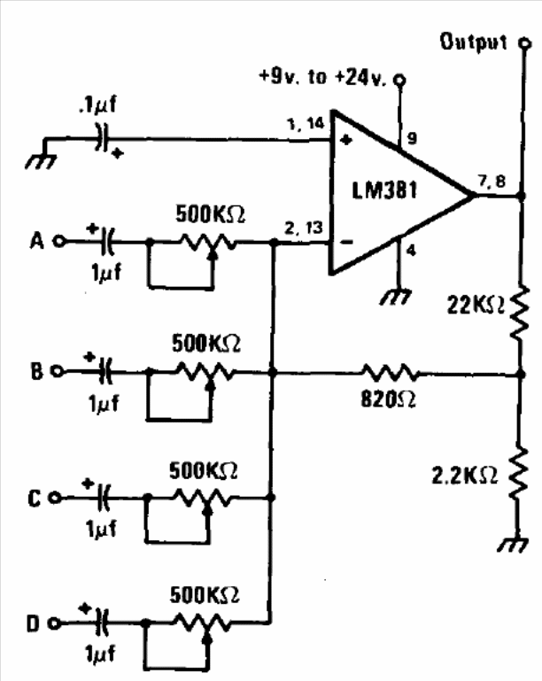 We found this circuit in a 1977 National Semiconductor technical documentation. The circuit has 4 input channels. The potentiometers can be 470 k and the signal cables must be shielded.
