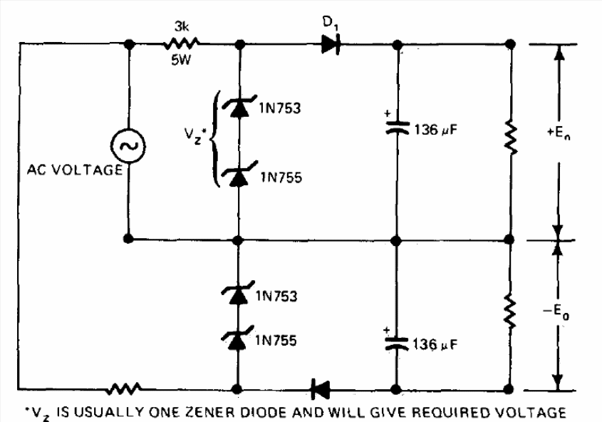 This symmetrical power supply provides a voltage of 12 V under a maximum current of 15 mA. The zeners determine the output voltage and can be changed. Electrolytics can be 150 uF. The circuit is from 1977 documentation.