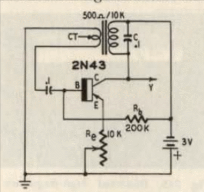 This circuit, obtained from a publication in the 1950s, uses a PNP germanium transistor and a transistorized transistor radio driver. The frequency depends on C and the potentiometer setting. The signal is taken from point Y of the circuit and has good intensity. This circuit can be adapted to work with more modern components.