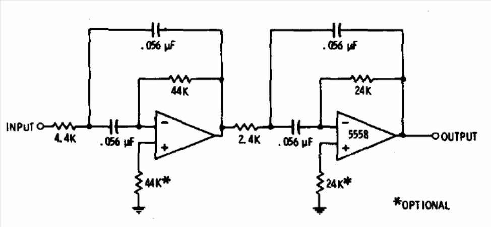 We found this circuit in a 1975 filter cookbook. The circuit can use other operational amplifiers and components can be changed to other frequencies. The power supply must be symmetrical, and the Q factor is 3.2.