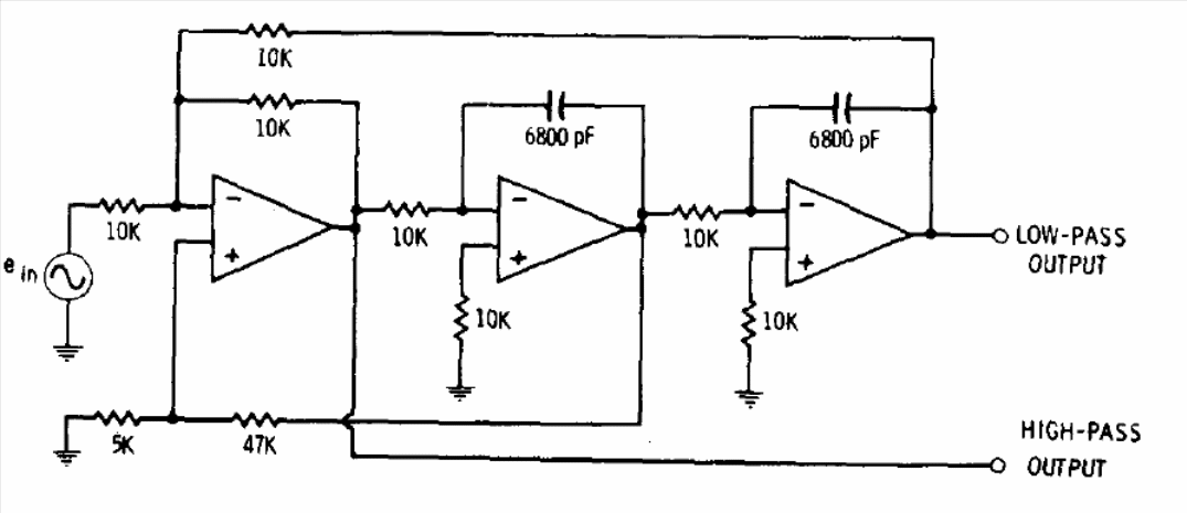 This circuit was obtained in a 1975 filter cookbook. The circuit can use other operational amplifiers and must be powered by a symmetrical source. The frequency can be changed by changing the capacitors.