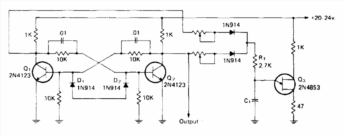 We found this circuit in a publication for radio amateurs in 1974. The bipolar transistors can be the BC548 and the unijunction can be the 2N2646. The generated frequency range depends on capacitor C.