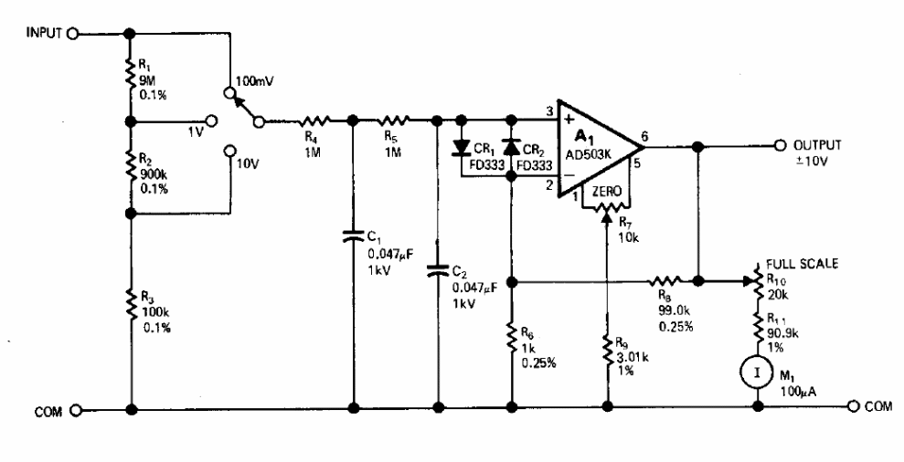 This circuit was found in an old publication from 1971. A 741 can be used in place of the original operational amplifier. The input resistance of the circuit is very high. An instrument with a larger scale can be used by changing R10.