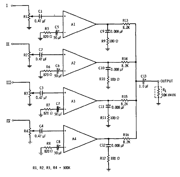 This circuit is from an old RCA documentation. Operational amplifiers can be more common types like the 741, powered by a symmetrical power source of 6 to 12 V. The signal input and output cables must be shielded.