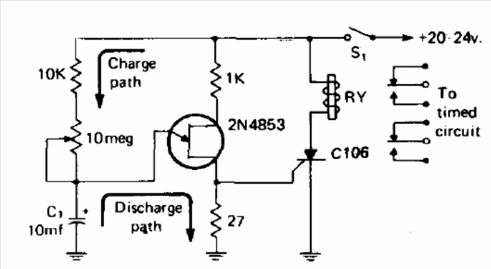 This circuit is from an old 1974 documentation. The circuit can be used to obtain longer intervals. The unijunction can be 2N2646 and the SCR the TIC106. The supply can be made with voltages from 9 to 24 V, depending on the relay used.