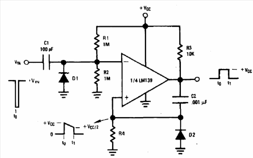We found this configuration in National Semiconductor's Linear applications Handbook. The circuit time is given by C2 and only one of the four comparators in the LM139 or equivalent is used. The power supply does not have to be symmetrical.