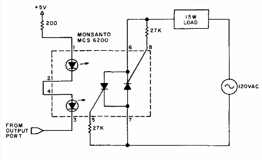 This shield circuit, from a documentation from the 70s, employs an optocoupler with two SCRs to control a small load of 1.5 W.