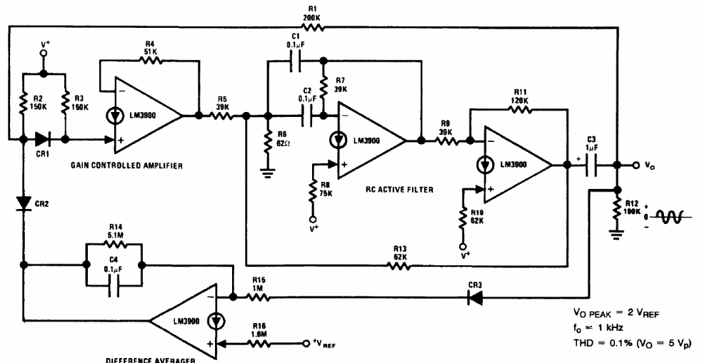We found this circuit in the 1994 Linear Applications Handbook from National Semiconductor. The circuit uses an LM3900 transconductance operational amplifier. Capacitors can be changed to produce signals from other frequencies.