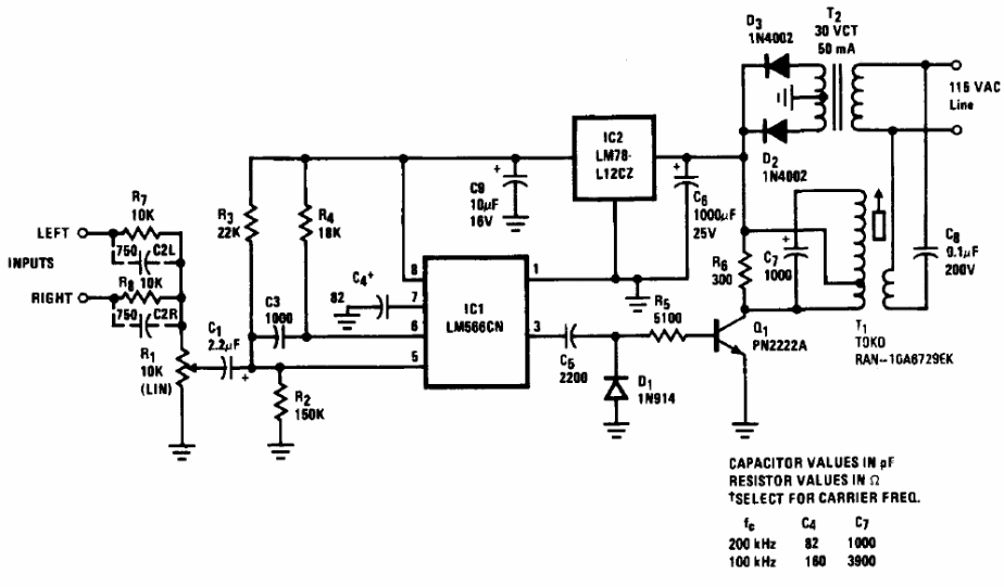 With this circuit it is possible to implement a wireless ambient sound distribution system using the power grid. The circuit is suggested by National Semiconductor in its 1994 Linear Applications Handbook. The coil can be wound with 300 turns of AWG 28 wire, and taken at 100 turns, with the secondary formed by 40 turns of the same wire in the same core.