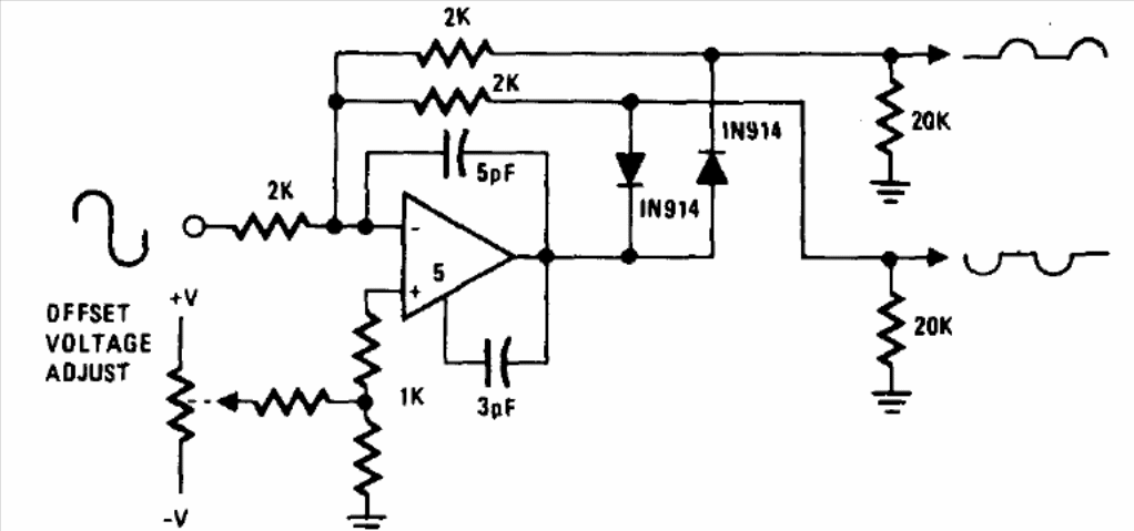 We found this circuit in a Harris Semiconductor Databook of 1977. The circuit can be implemented with any other operational amplifier and the resistors of non-standard values can be approximated to the common values today. The circuit separates the semicycles from an alternating signal.
