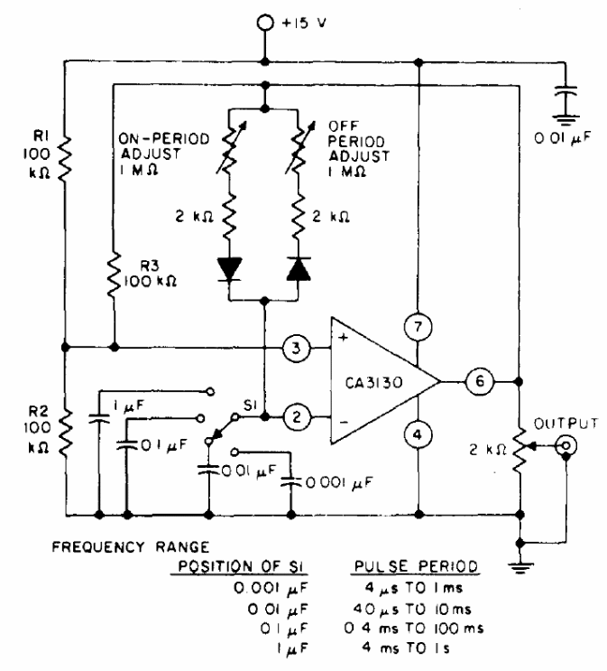 This circuit is from a 1977 RCA manual of integrated circuits. The company no longer exists, and the integrated circuit admits equivalents. In it we can adjust the times of the output signal according to the table next to the diagram.