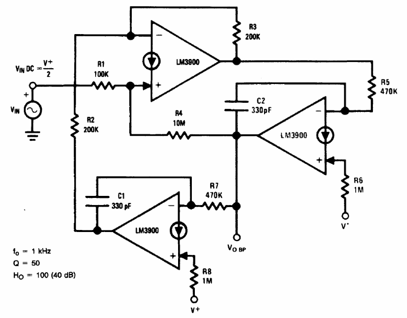 This filter with a Q factor of 50 was found in the Linear Applications Handbook by National Semiconductor. It makes use of a transconductance operational amplifier, which can be changed to operate on other frequencies.