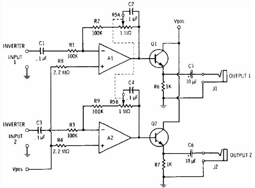 This small stereo amplifier for headphones was found in a documentation on integrated circuits from 1975. The transistors can be 2N2222 and the power can be made with voltages from 9 to 15 V. The circuit is for low and medium impedance headphones.